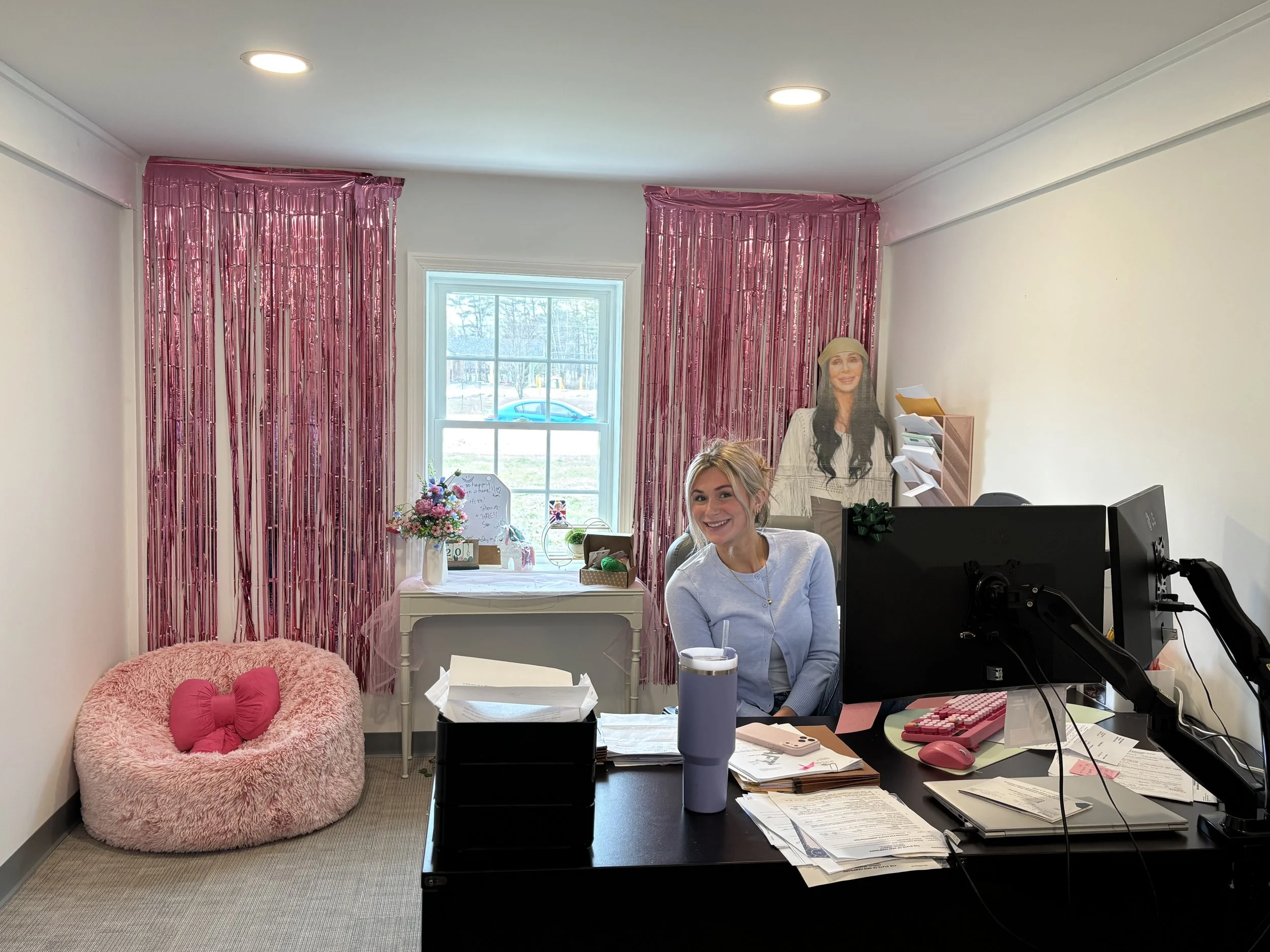 • Fun Pink and Cher office decor in Caelyn's office